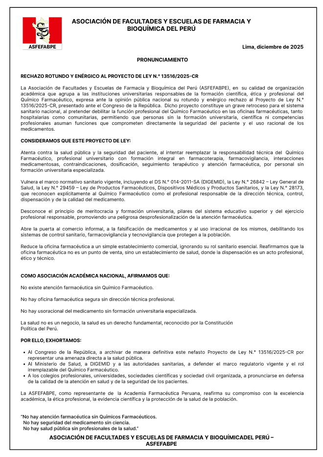 La Asociación de Facultades y Escuelas de Farmacia y Bioquímica del Perú, institución con personería jurídica de derecho privado sin fines de lucro.
